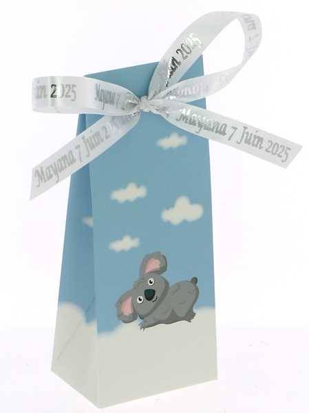 Boite dragées koala et son ruban personnalisé, confectionnée artisanalement et garni de dragées par mes soins dans mon atelier.