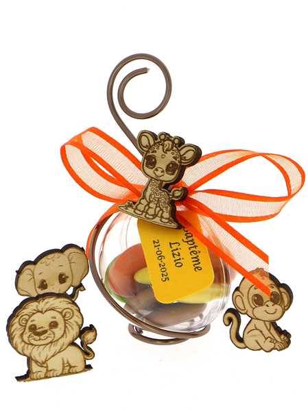 Très sympa la boule dragées jungle. Composez votre thème baptême avec nos adorables figurines Animaux Jungle et vous épaterez vos invités. Contenant transparent garni de dragées chocolat mélange Jungle.Pour toutes modification de couleurs n'hésitez pas à me contacter.