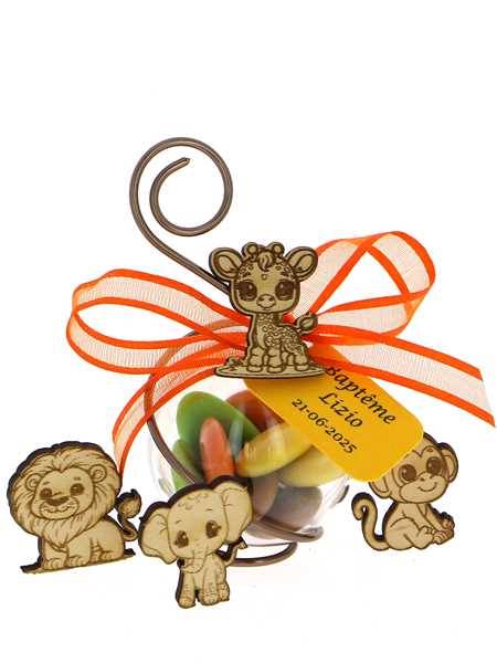 Contenant dragées jungle livré avec dragées maison Pécou et décors.