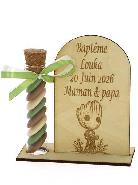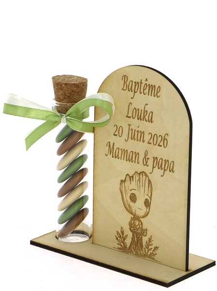 Cadeau Parrain Marraine Éprouvette Bois Groot, Dragées Baptême Groot