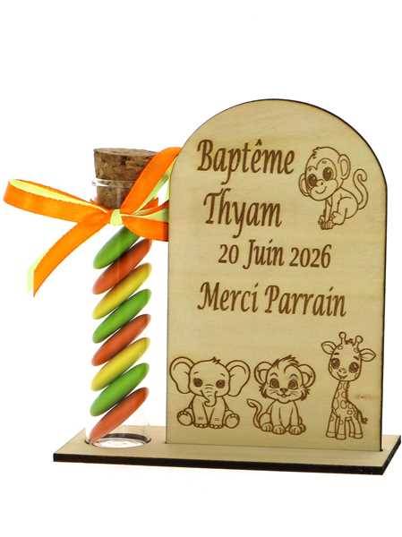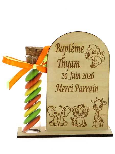 Cadeau Parrain Marraine Éprouvette Bois Personnalisé jungle - Baptême Animaux Jungle