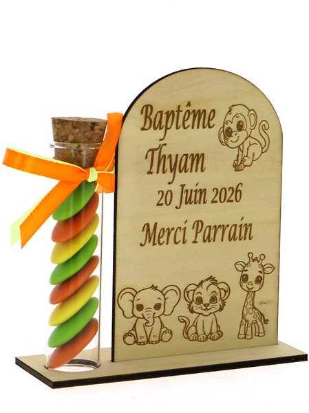Offrez un cadeau unique et naturel aux parrains, marraines, mamies, papys et famille proche. En bois noble gravé, accompagné d'une éprouvette en verre remplie de dragées au chocolat , ce présent allie élégance et authenticité.