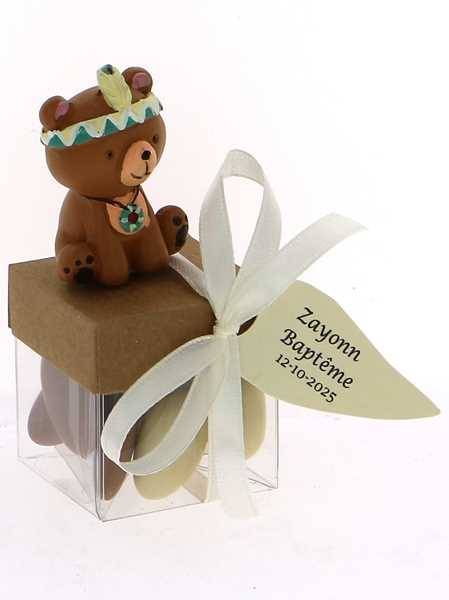 Cube dragées baptême animaux, rempli de délicates dragées amande et chocolat, surmonté d'un tendre ourson. Soigneusement réalisé avec des matériaux de qualité, il est entièrement personnalisable pour s'accorder à votre événement. Un doux souvenir à offrir à vos invités pour une naissance ou un baptême.