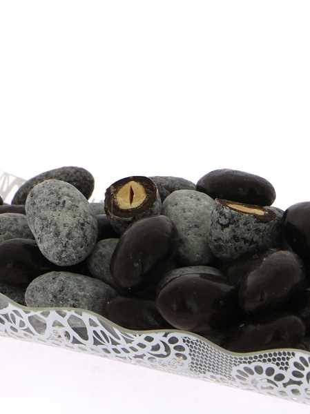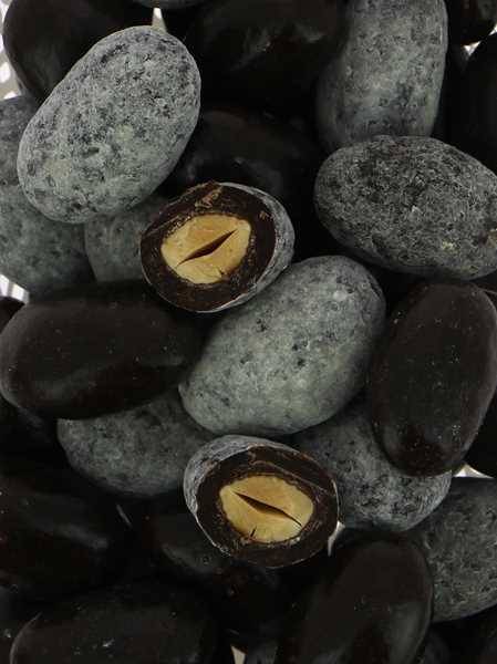 Amande grillé enrobé de chocolat noir et amande grillé enrobé de chocolat noir et poudré de cacao.