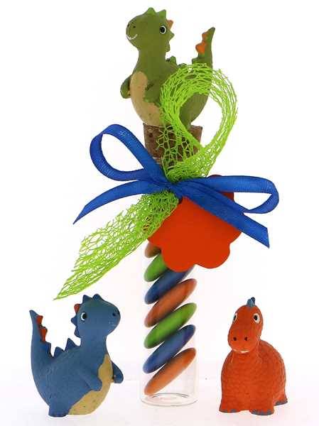 Offrez à vos invités une magnifique figurine dinosaure accompagnée de son éprouvette et de ses dragées haute qualité. Une décoration de baptême originale et coloré pour des cadeaux invités uniques et personnalisés.