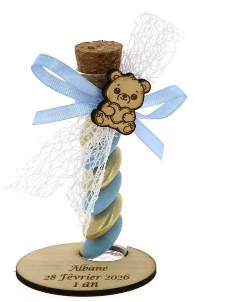 Craquez pour cette éprouvette en verre garnie de dragées et parfaite pour un baptême sur le thème ourson. Déposée sur un socle en bois gravé personnalisé au texte de votre choix, elle offre à vos invités un souvenir tendre, naturel et élégant.