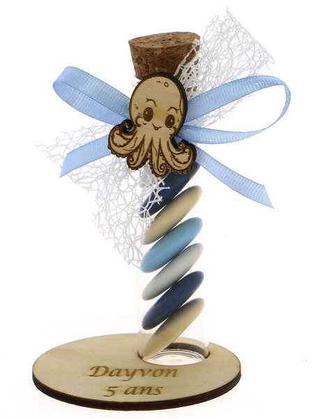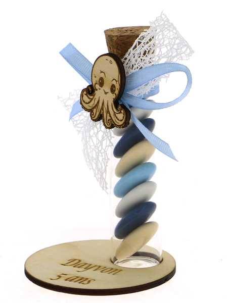 Éprouvette Dragées Baptême Poulpe et son socle bois - Baptême à la Mer