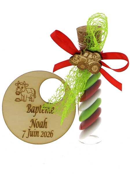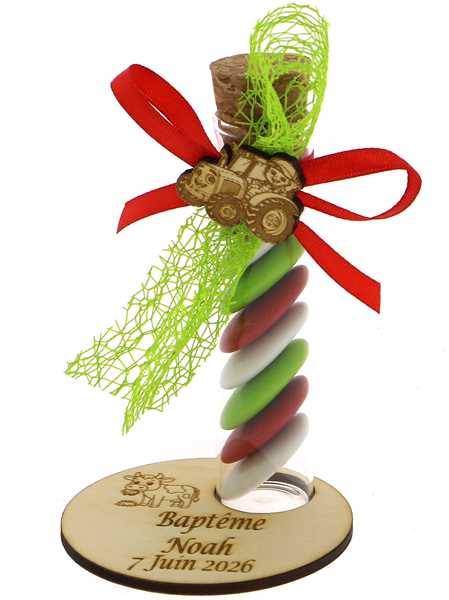 Éprouvette Dragées Baptême Tracteur Socle Bois - Dragées Baptême à la Ferme
