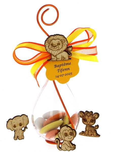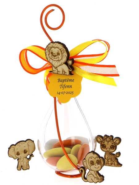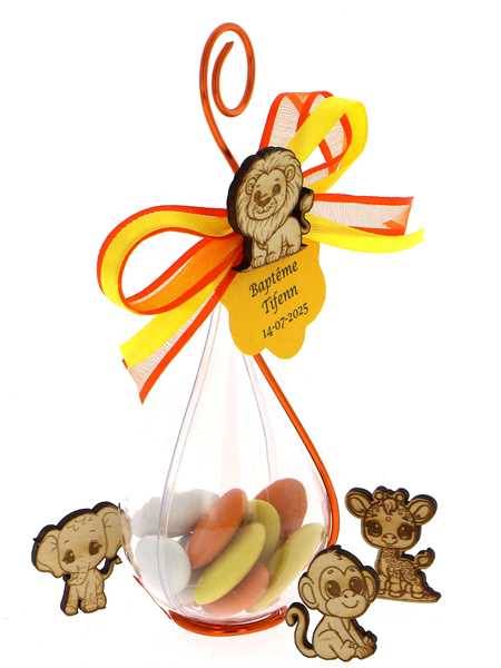 Goutte dragées jungle décorée de sa figurine Animaux jungle, de rubans et d'une étiquette. Une décoration de table à croquer qui ravira vos invités. Contenant transparent garni de dragées chocolat mélange jungle et dragées amande. Le thème baptême jungle est idéal pour un baptême ou un anniversaire coloré. Les couleurs sont modifiables sur demande sans supplément de tarif.